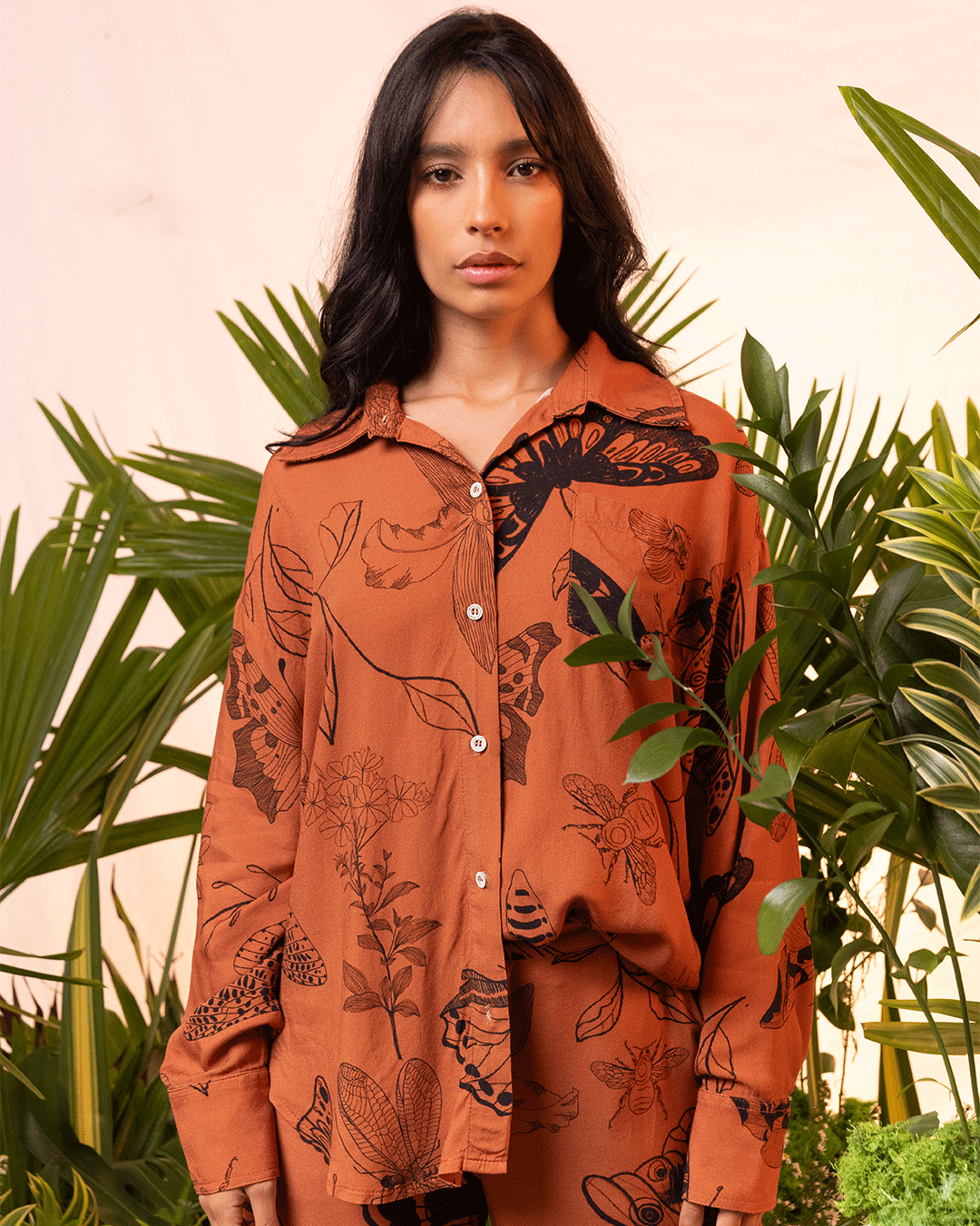 This terracotta rayon long-sleeved shirt features a unique butterfly and floral print. With a relaxed fit and button-front, it's perfect for a fresh and stylish look.