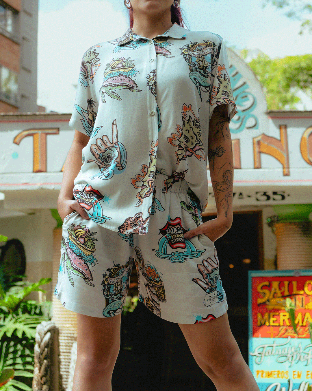 These unisex shorts, part of the Sailors X Bohío collaboration, are inspired by the vibrant Bahía Solano. With their ecru color and exclusive print that reflects the essence of the sea and nature, they're perfect for those seeking a relaxed and authentic style. Made from soft chali, they're ideal for hot days, offering coolness and comfort without losing the unique touch of the Colombian coast.
