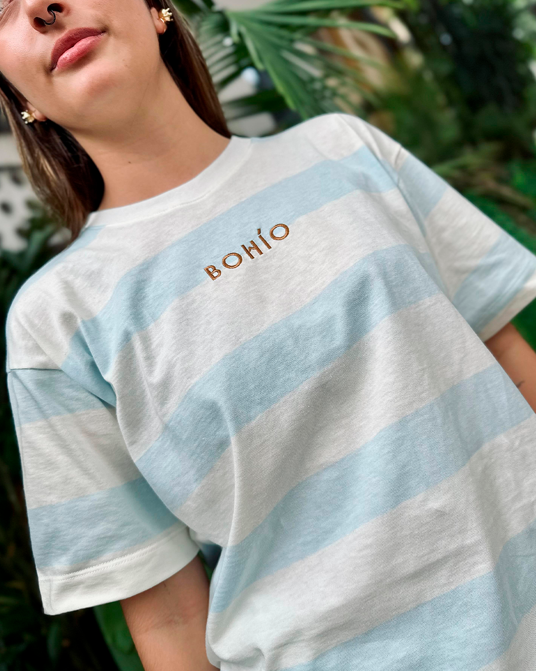 Detalle: Logo "BOHÍO" bordado en el centro del pecho, agregando un elemento sutil y distintivo de la marca. Y bordado trasero en forma de sol.