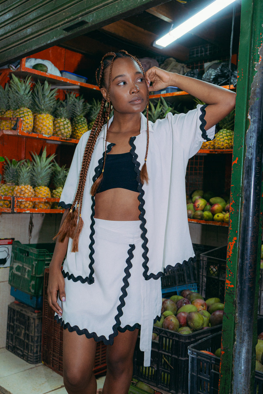 Combínalo con el top o kimono del mismo set para un look completo, o con tops lisos (negro, blanco, beige) y sandalias.